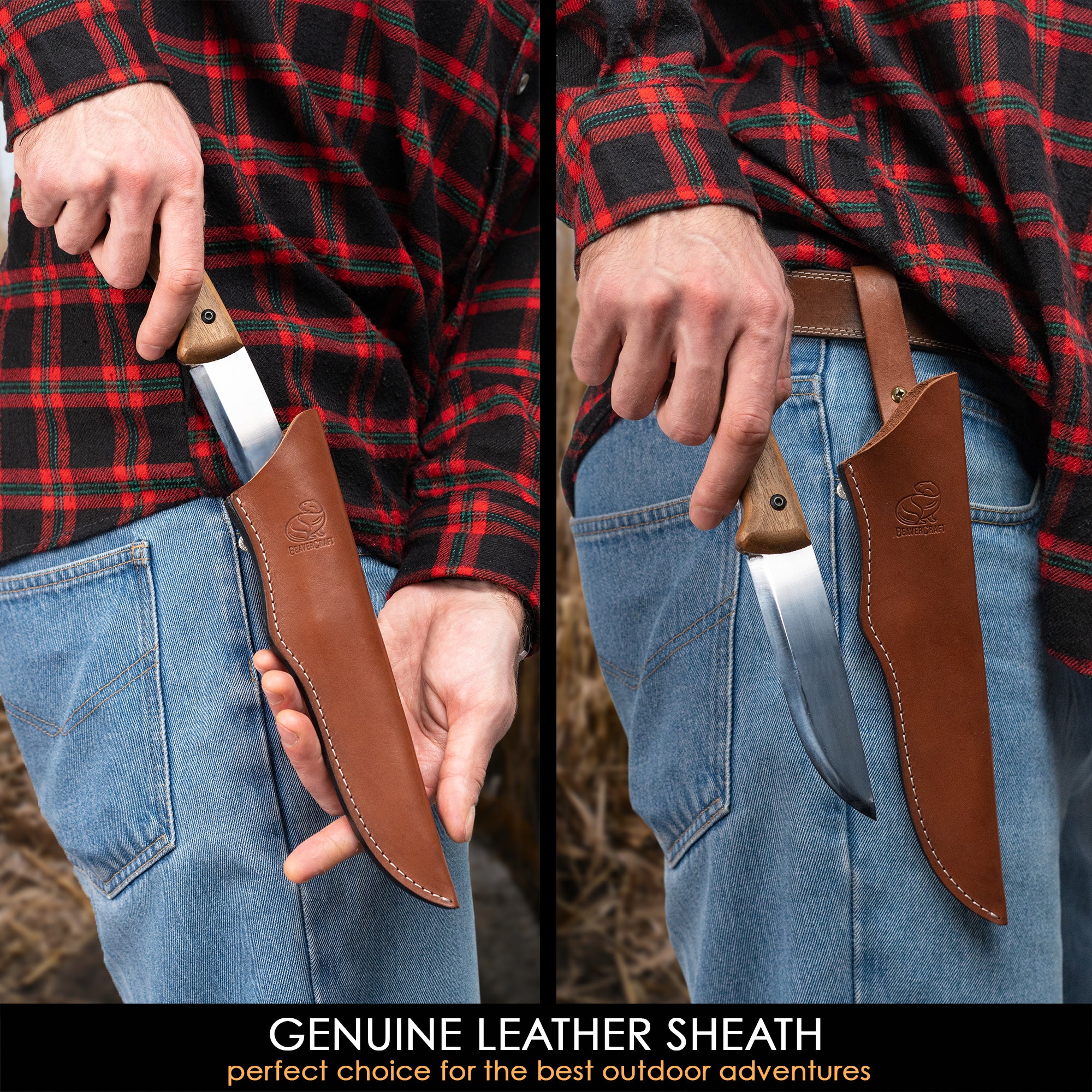 מגיע עם נדן עור פרה לנשיאה קלה ובטוחה בזמן ציד, דיג או תרמילאים.